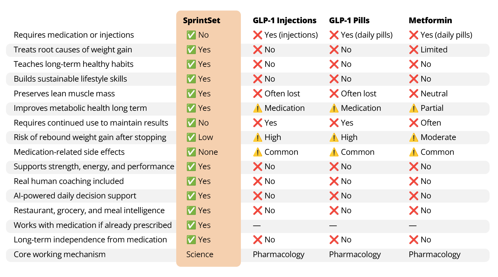Whether you’re starting fresh, supplementing a GLP-1, or planning your long-term health strategy, SprintSet gives you the structure, support, and intelligence to lose weight safely and keep it off for good.